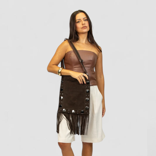 Bolsa Tiracolo Boho James Couro Legítimo Café Com Franjas Patrícia Maranhão
