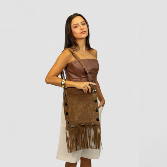 Bolsa Tiracolo Boho James Couro Legítimo Mocha Mousse Com Franjas Patrícia Maranhão