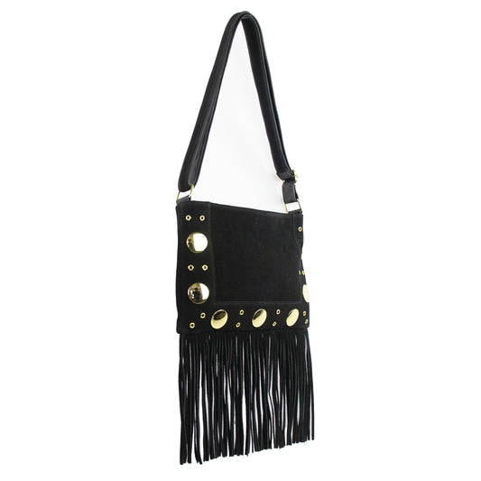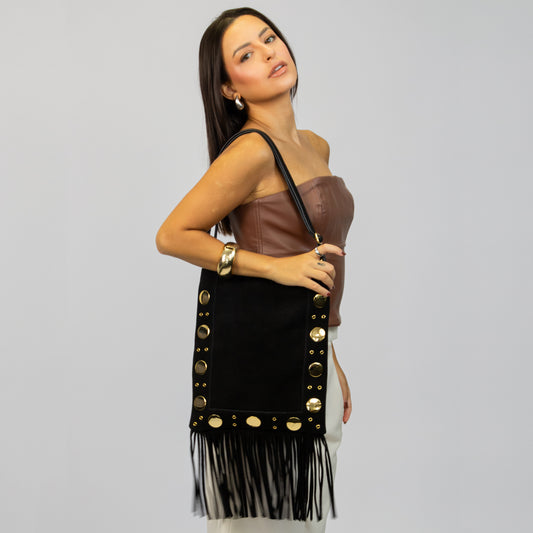 Bolsa Tiracolo Boho James Couro Legítimo Preto Com Franjas Patrícia Maranhão