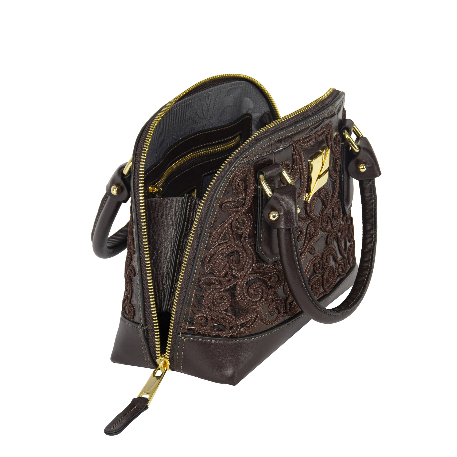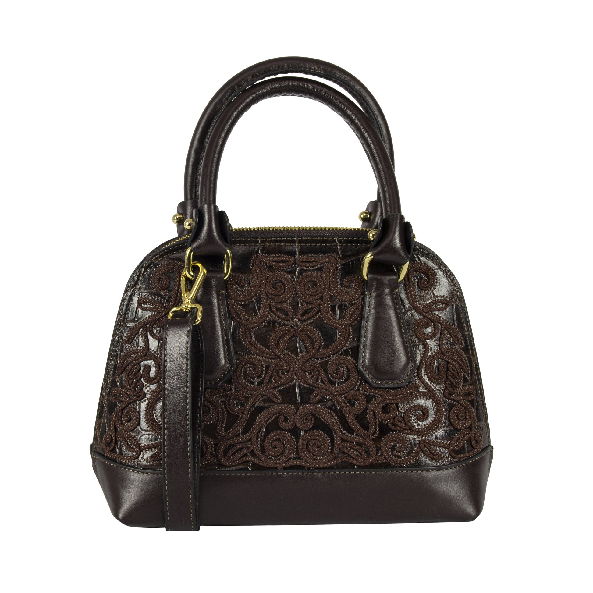 A silhueta icônica da Serena se transforma em uma tela. Sobre a base nobre do couro legítimo com textura croco, uma nova camada de arte é revelada: painéis de couro com design inspirado nos arabescos do barroco são meticulosamente costurados sobre as superfícies frontal e traseira. Este trabalho cria um contraste único de texturas e um relevo sutil, transformando a peça em uma verdadeira obra de arte tátil, rica em detalhes.