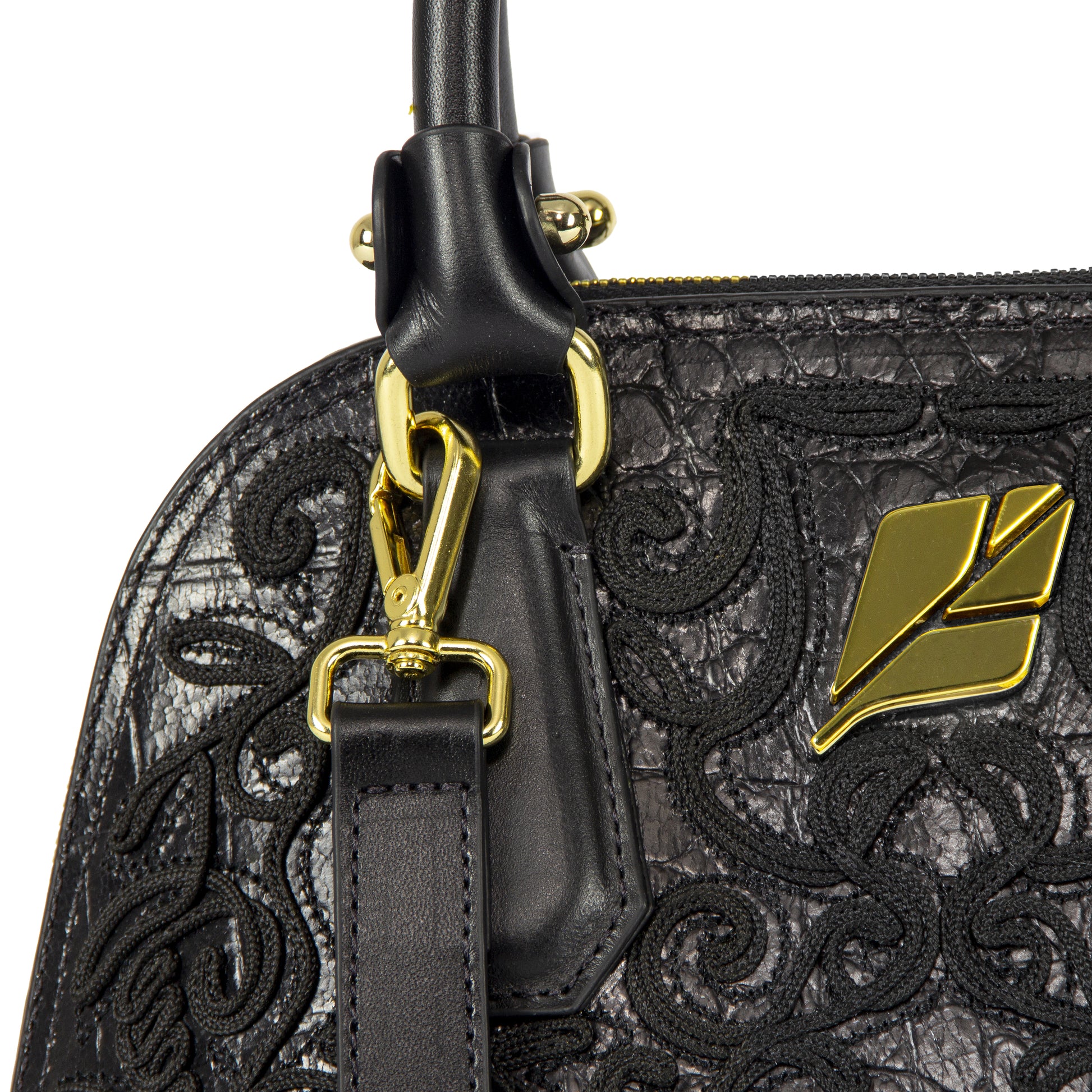 A silhueta icônica da Serena se transforma em uma tela. Sobre a base nobre do couro legítimo com textura croco, uma nova camada de arte é revelada: painéis de couro com design inspirado nos arabescos do barroco são meticulosamente costurados sobre as superfícies frontal e traseira. Este trabalho cria um contraste único de texturas e um relevo sutil, transformando a peça em uma verdadeira obra de arte tátil, rica em detalhes.