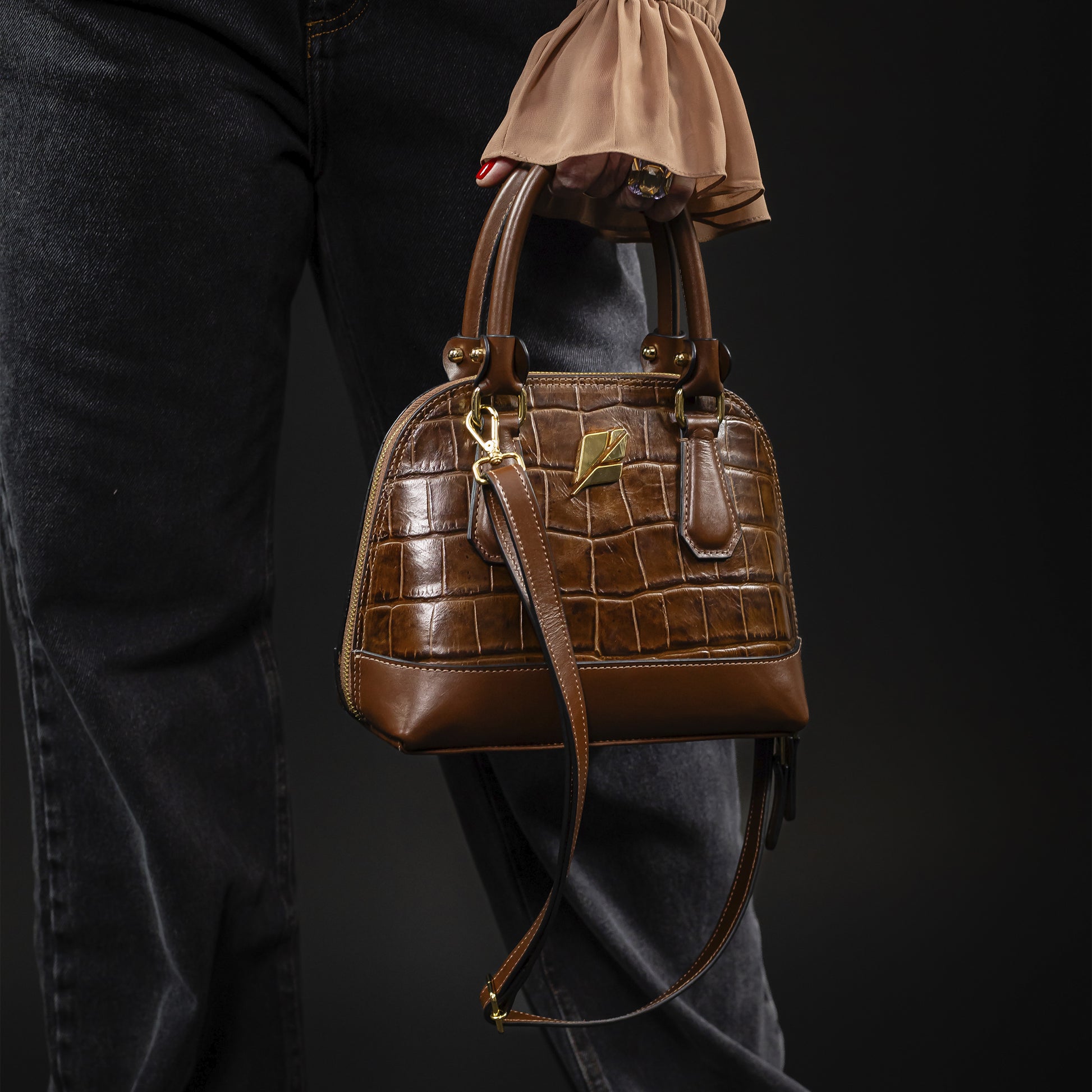 Feita em couro legítimo, a Serena é uma peça estruturada e versátil. Suas alças de mão são perfeitas para um look clássico e imponente, enquanto a alça longa removível a transforma em uma companheira prática para o dia a dia.